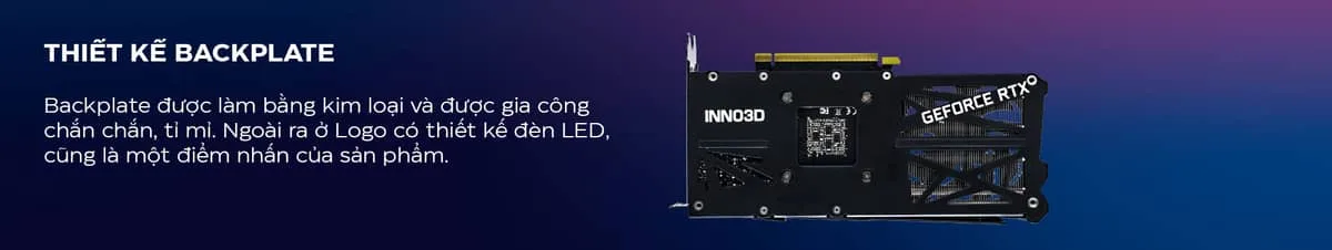 Một ưu điểm không thể bỏ qua là kích thước 24.0 x 12.0 cm – Thiết kế chỉ chiếm 2 khe cắm (2-slot), chiếc card này cực kỳ “thân thiện” với các bộ máy có không gian hạn chế mà không lo vướng víu. Để tăng cường độ bền, INNO3D đã trang bị một tấm Backplate (giáp lưng) bằng kim loại cứng cáp giúp card không bị cong vênh sau thời gian dài sử dụng do trọng lượng và bảo vệ các linh kiện nhỏ ở mặt sau khỏi những va chạm vô tình trong quá trình lắp đặt.