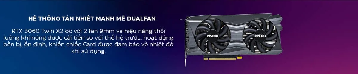 Card màn hình INNO3D RTX 3060 TWIN X2 12GB – Chiếc card màn hình đến từ thương hiệu INNO3D vốn nổi tiếng với sự bền bỉ và thực dụng. Được xây dựng trên nền tảng kiến trúc NVIDIA Ampere tiên tiến, công nghệ dò tia (Ray Tracing) chân thực, trí tuệ nhân tạo (DLSS) thông minh, dung lượng bộ nhớ vượt trội hứa hẹn sẽ là người đồng hành đáng tin cậy, sẵn sàng chinh phục mọi thử thách từ những trận chiến game nảy lửa cho đến các tác vụ đồ họa chuyên sâu của các nhà sáng tạo nội dung.