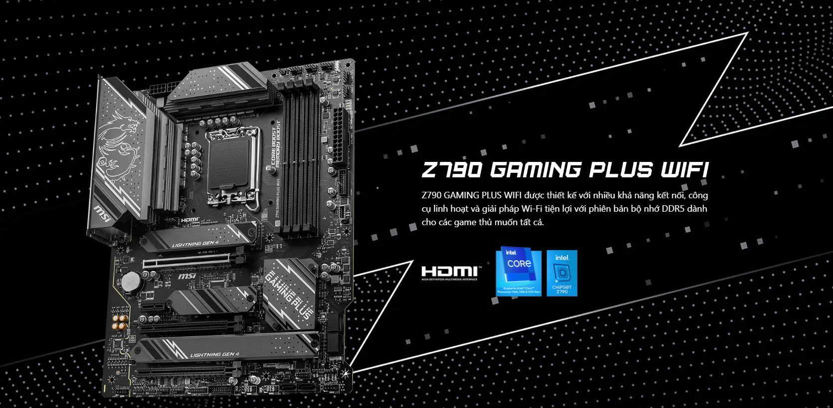 Mainboard PC MSI Z790 GAMING PLUS WIFI hỗ trợ ép xung RAM DDR5 đến 7200+(OC) MHz, cung cấp khả năng truy cập băng thông bộ nhớ và bổ sung các vùng che chắn giúp giảm đáng kể nhiễu xuyên âm.